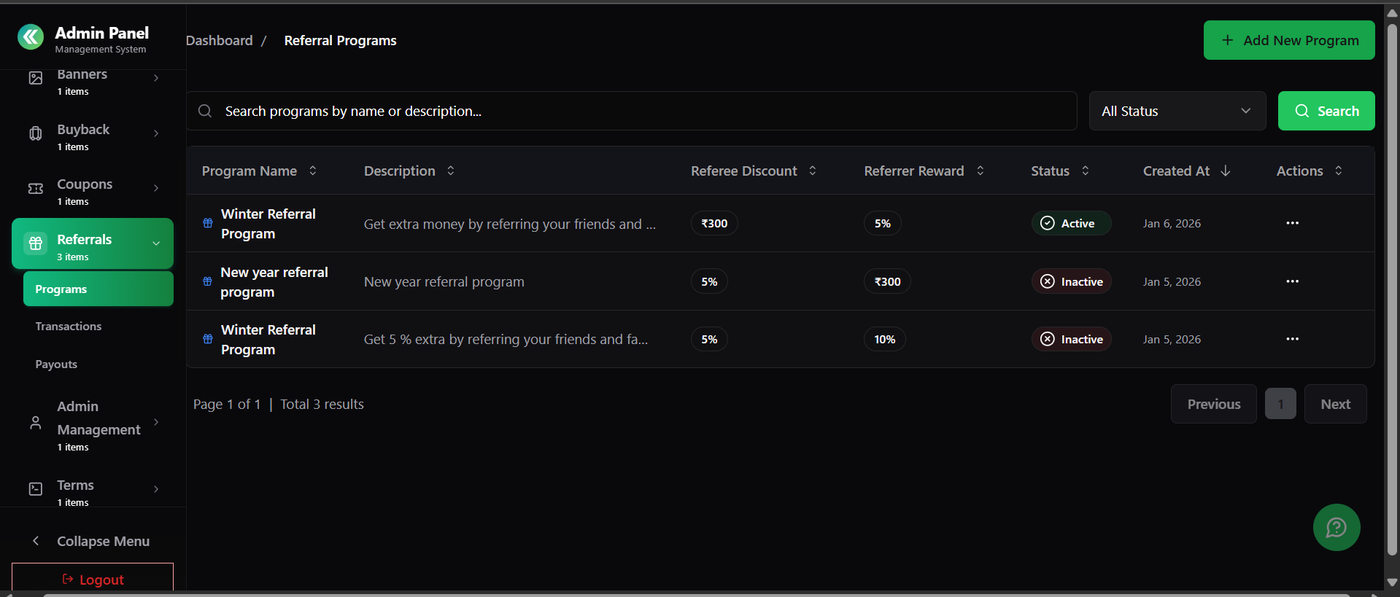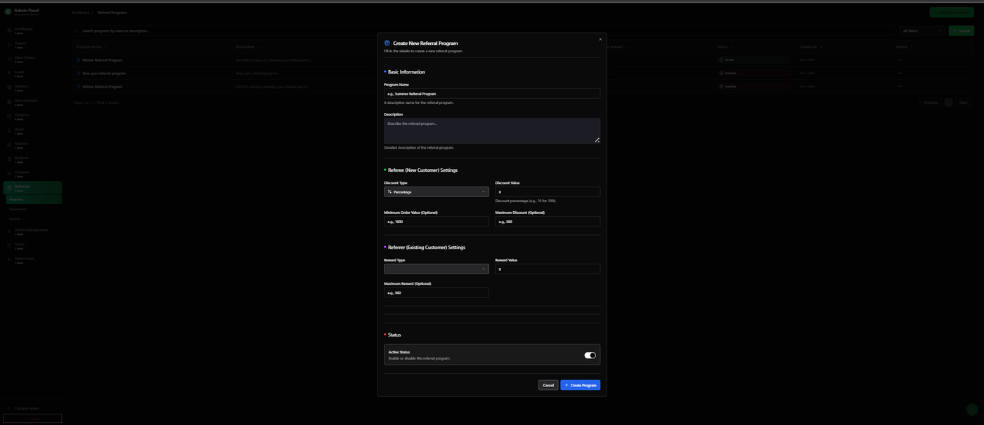 2. Referral Program (Admin Panel)